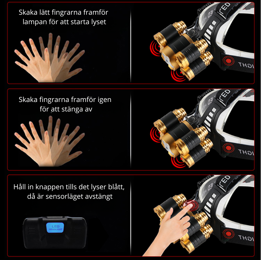 Ett måste nu när mörkret kommer. Lys upp rejält framför dig med denna pannlampa med LED som dessutom har sensor för enkel användning. Den är lätt och smidig väger 175g. Passar bra att ha på hjälp då den går att förstora och förminska.